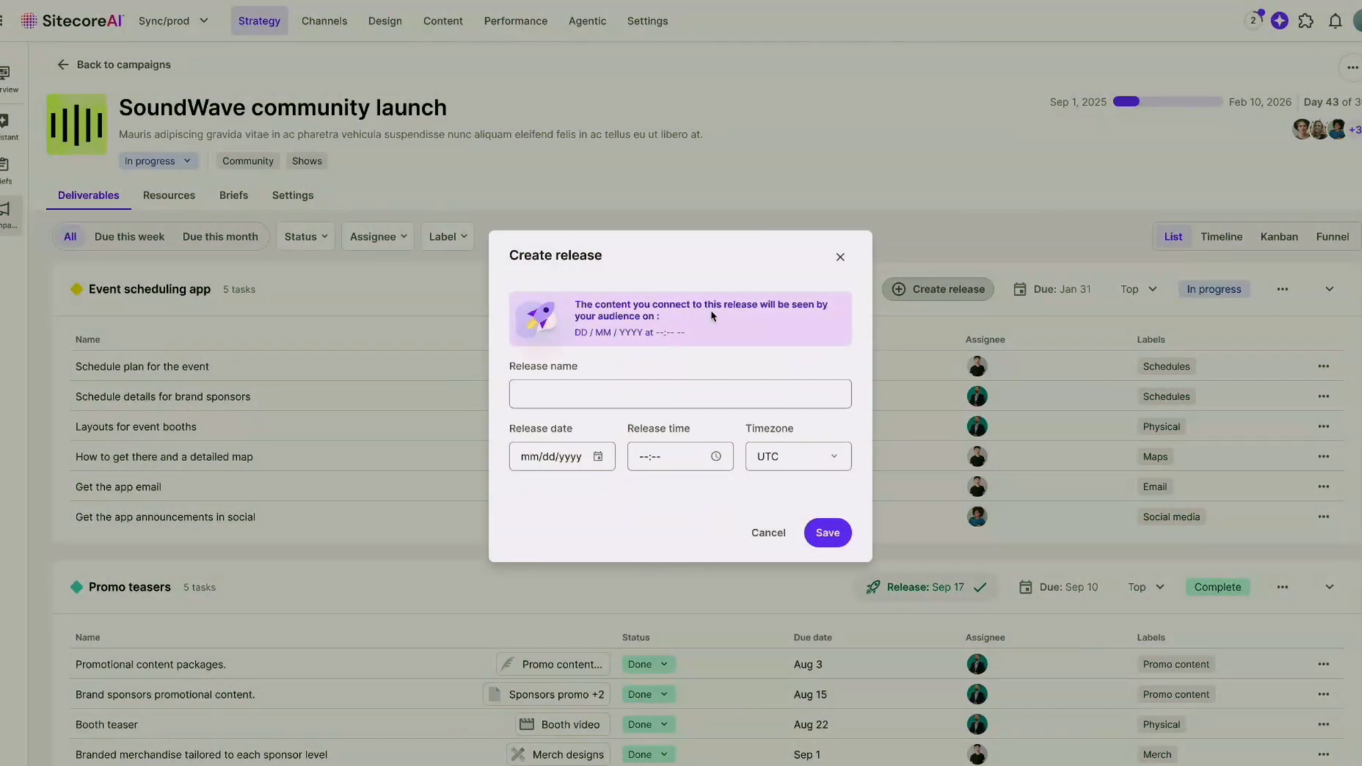 Campaign Releases brings everything into one orchestrated space. From the very first campaign brief, you can define tasks, assign owners, track progress, and even factor in offline or external activities. It keeps creative, content, marketing and development teams aligned in a way that feels natural, not forced, and you can see every planned release laid out at a glance instead of trying to piece it together across tools and spreadsheets.