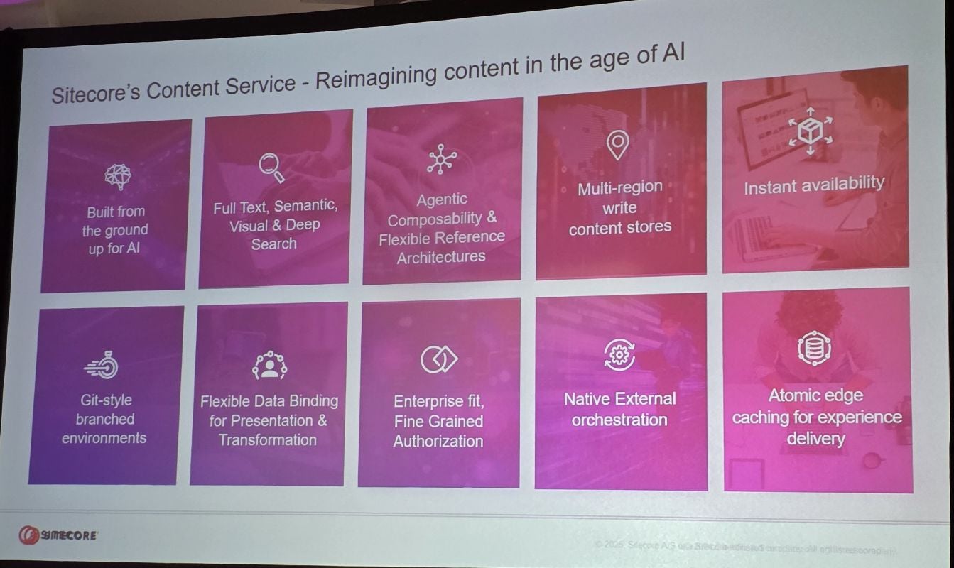 They explained the new Content Service will be powering all content management through SitecoreAI and will underpin the current offerings as they replace old systems and infrastructure. And this is the beauty and power of SaaS – this all happens behind the scenes without any disruption to you. By moving to CosmosDB, a fully managed, globally distributed and serverless NoSQL database, they can truly scale and provide secure multi-tenant applications without the limitation of SQL Server whilst providing support for the modern era of AI.