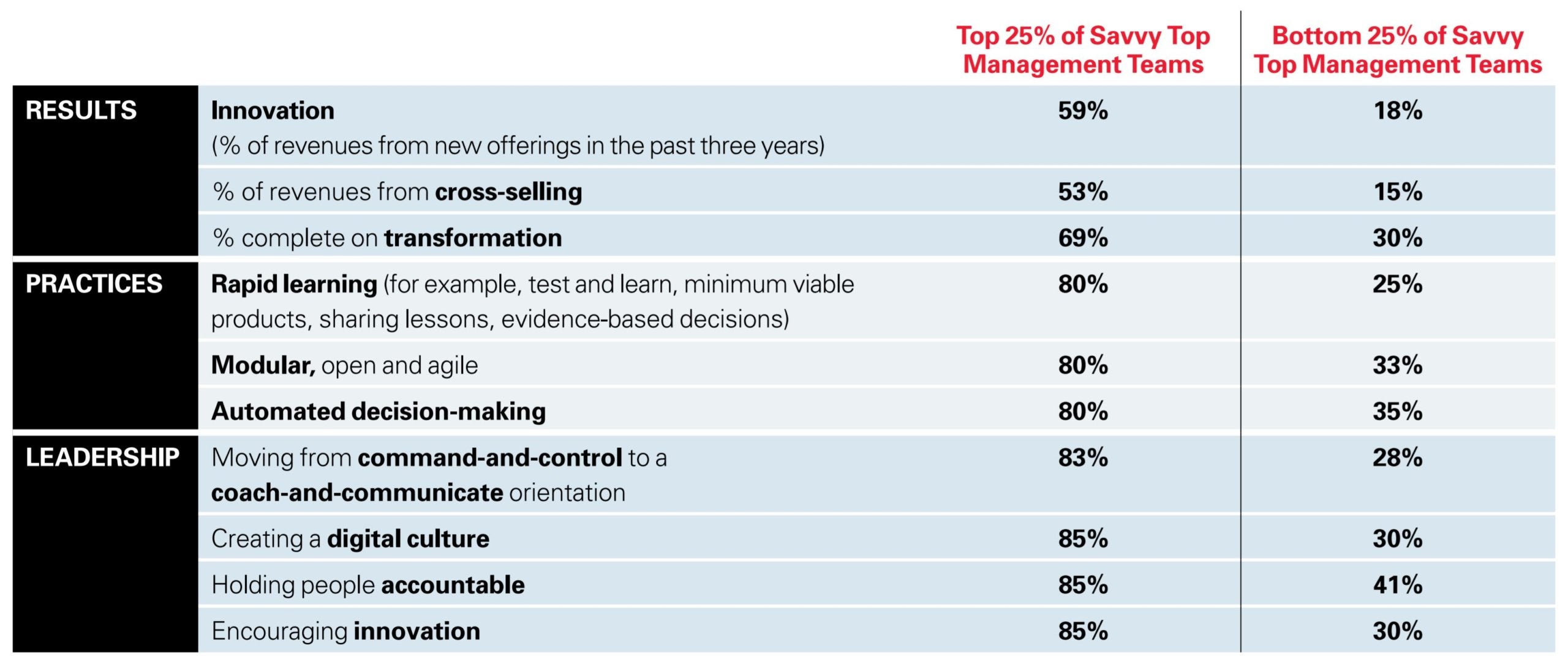 The most digitally savvy top teams are far more likely to produce results through innovation and empowered workforces than the least savvy teams. They achieve this through: